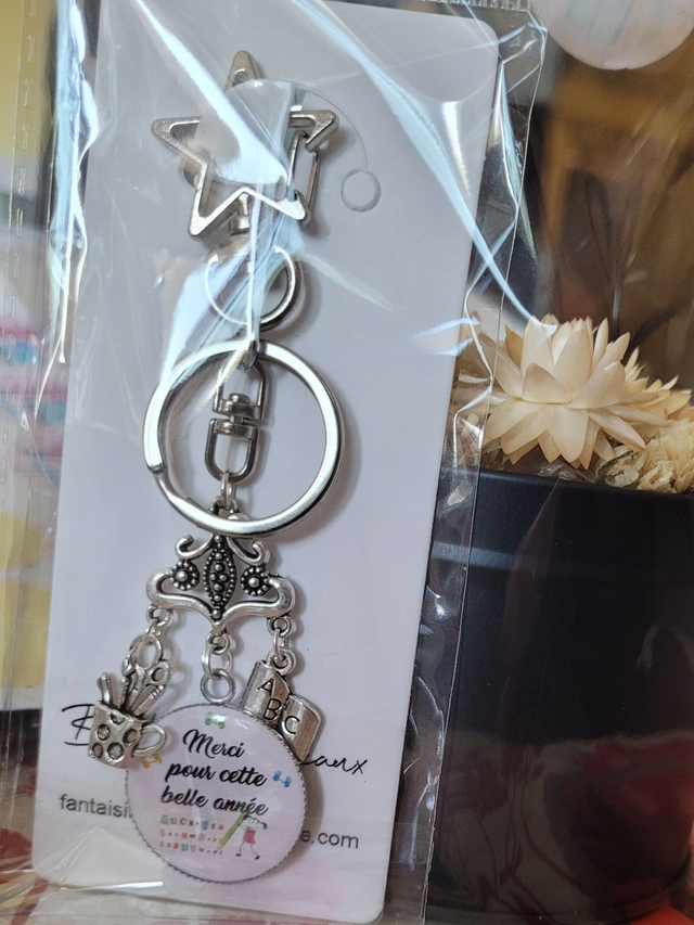 Accroche Clés argenté avec mousqueton breloques ,anneau porte-clés et cabochon Merci pour cette belle année et composition de fleurs séchées de