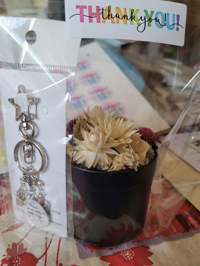 Pochette cadeau AccClés Merci pour cette belle année & composition fleurs séchées