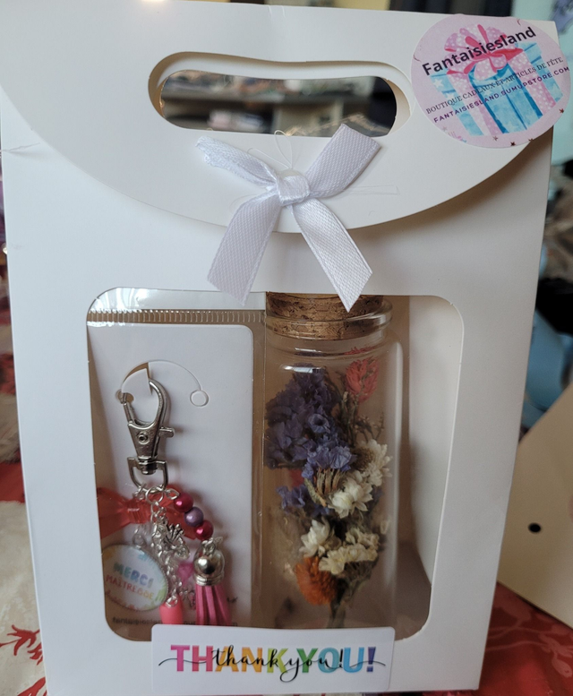 Pochette cadeau bijou de sac Merci Maîtresse & flacon fleurs séchées pohline